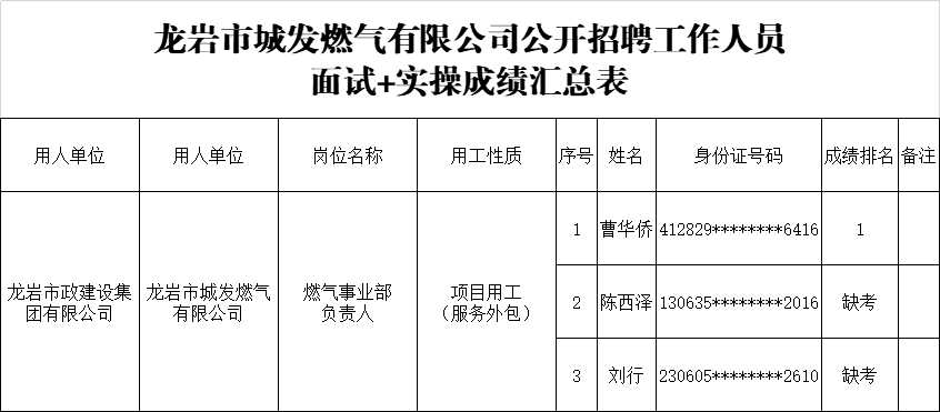 龍巖市政建設集團有限公司所屬企業公開招聘工作人員擬錄用公示 根據 2025年4月21日發布的《龍巖市政建設集團有限公司關于公開招聘工作人員的公告》有關要求,經報名、資格審查、組織考試、體檢、考察等程序,現將龍巖市城發燃氣有限公司燃氣事業部負責人崗位擬錄用人員名…