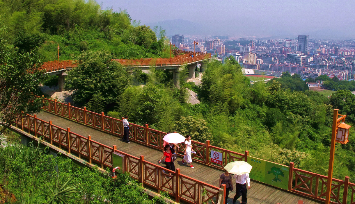 蓮花山底南環路地面標高為330米,山頂標高為490.606米,山高160米左右,山頂已開發為休閑場所,并建有世紀鐘樓,山腳可挖掘的景點不多,因此決定在半山腰開辟一條市民休閑的木棧道,將公園增加一個休閑觀光的好場所,并可成為蓮花山一道亮麗的風景線。因此在半山腰422米高程建設一條環山的木棧道。為盡量少破壞山體植被,木棧道采用棧道橋形式,全長3781.88米,全寬3.5米(包括欄桿寬度),凈寬3.0米,蓮花山棧道橋工程總投資7610萬元。