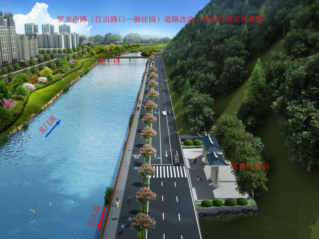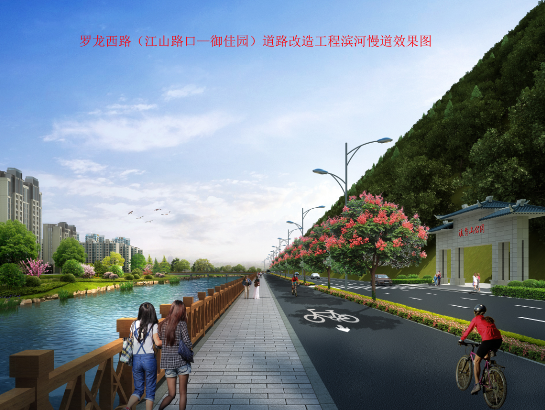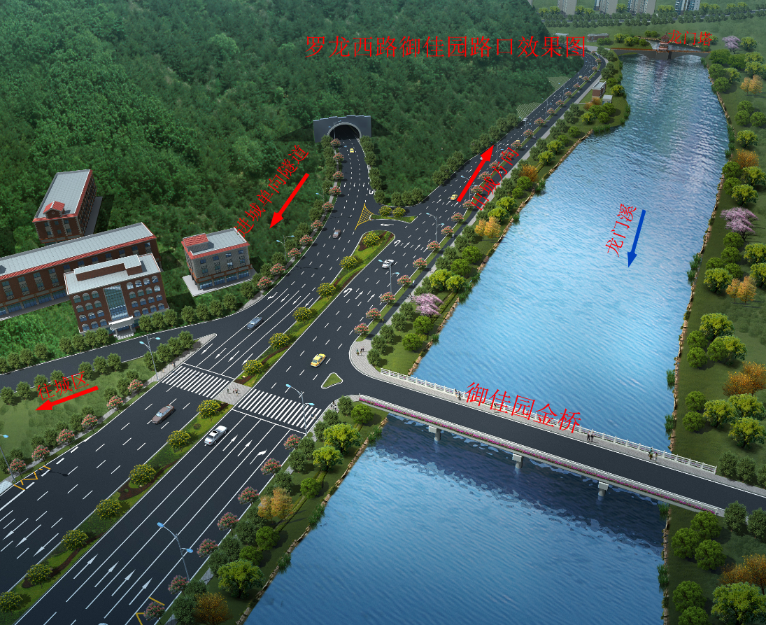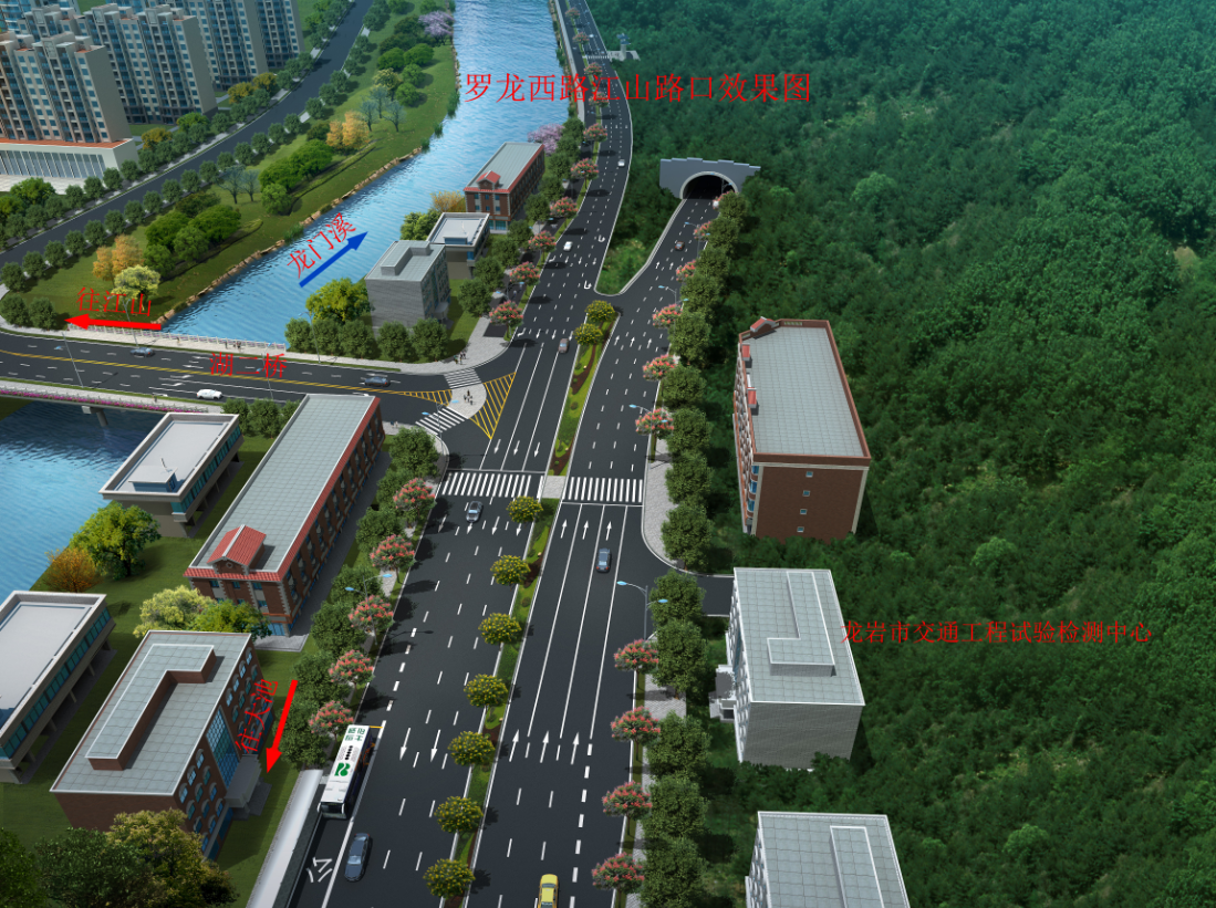 羅龍西路是連接龍巖西高速出入口與中心城市的唯一通道,其規劃改造范圍從紅竹山橋至御佳園路口,全長3855米,計劃將原道路拓寬至40米,實行雙向六車道,兩旁設2.5米非機動車道,并在湖二橋路口以東設640米入城單向三車道隧道連接至御佳園路口,原羅龍西路湖二橋至御佳園段將調整為出城單向車道。